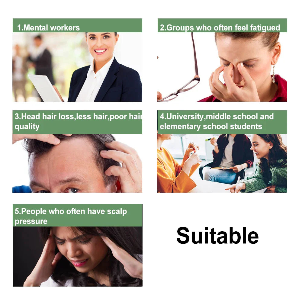 2. Comfortable massage: 4 kneading claws, 96 protruding acupoint contacts, soft silicone material, allowing your head skin and acupoint nerves to be fully and deeply relaxed. The numbness starting from the scalp directly leads to the relaxation of the whole body's nerves, which cannot be pulled out.